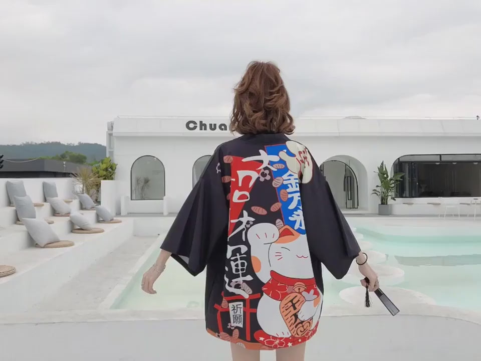 Transform your wardrobe with the Kawaii Lucky Cat Japanese Kimono, perfect for those who appreciate unique and trendy style. 🥰